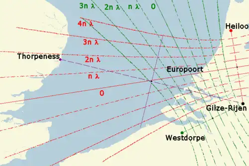 De onderstaande afbeelding toont een kaart met hierop enkele rode en groene hyperbolen van de zogenaamde E2-keten die bestemd is voor navigatie in de buurt van de Europoort. De rechte lijn representeert het speciale geval waarin het afstandsverschil naar de zenders gelijk is aan 0 (deze is ook voor de paarse zender getekend). De ontvanger werkt het nauwkeurigst in de buurt van deze lijn. Te zien is dat het snijpunt van de groene 0-lijn en de rode 0-lijn vrijwel gelijk ligt met de monding van de Europoort. De andere hyperbolen representeren een hyperbool waarvoor het afstandsverschil een veelvoud is van de gebruikte golflengte.