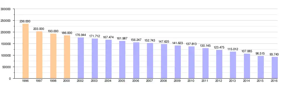 | Oplage van de krant[5][6][7] tussen 1996 en 2016 |