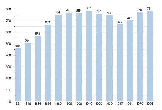 - Bronnen:NIS, Opm:1831 t/m 1970=volkstellingen; 1976=inwoneraantal op 31 december