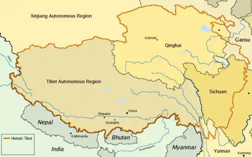 - ↑ "It will also have to be based on the principle which the wise rulers of Tibet and of China laid down in a treaty as early as 823 A.D., carved on the pillar which still stands today in front of the Jo-khang, Tibet's holiest shrine, in Lhasa, that Tibetans will live happily in the great land of Tibet, and the Chinese will live happily in the great land of China". Zie The 14th Dalai Lama - Acceptance Speech. Gearchiveerd op 19 oktober 2017.