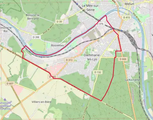 De onderstaande kaart toont de ligging van Dammarie-lès-Lys met de belangrijkste infrastructuur en aangrenzende gemeenten.