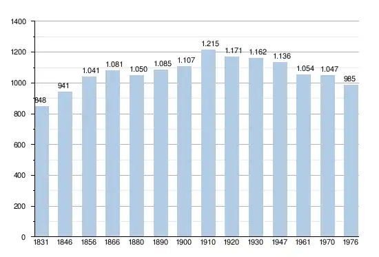 - Bronnen:NIS, Opm:1831 tot en met 1970=volkstellingen; 1976 = inwoneraantal op 31 december