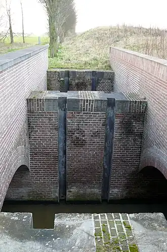 De damsluizen voorkomen dat water uit een inundatiegebied stroomt of voorkomt dat bepaalde stukken land tijdens inundatie onder water komen te staan. Inundaties werden allen gebruikt als een vijandelijk leger oprukte en de eigen stellingen bedreigde. In oorlogstijd werden de damsluizen afgesloten, maar anders bleven de damsluizen open om de normale afwatering niet te verstoren.