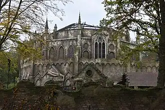 De koorbanken draaien naar het orgel aan de muur, dat begint te spelen. De dirigent, Joseph Charlatan, uitgevoerd als animatronic, verschijnt zwevend voor het orgel. Terwijl de Danse macabre begint te spelen, komt de draaischijf onder de bezoekers in beweging. Ook de koorbanken zelf beginnen te draaien, waardoor de bezoekers vanuit hun zitplaats als het ware zelf een dodendans uitvoeren (in het Spookslot zagen zij deze slechts als een show achter een glazen wand). Diverse decorstukken en animatronics worden belicht en komen tot leven: de balustrade beweegt, en uit ronde openingen in de muur verschijnen orkestleden. Er is onder meer een pianist te zien die zijn hoofd 180 graden draait, drie orkestleden met een triangel en een muzikante die de harp bespeelt en haar hoofd van haar romp kan halen. In enkele nissen van de abdij is een zwevende viool te zien, gecreëerd door middel van projectie. Dit is een verwijzing naar het gesloopte Spookslot. Onder de draaischijf ligt de crypte. De vloer ligt vol schedels en af en toe verschijnt het personage Esmeralda uit haar graf. Dit tafereel is overgenomen vanuit het Spookslot. Wat zich in de crypte afspeelt is alleen zichtbaar wanneer de draaischijf gekanteld is.[50]
