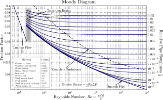 waarin de hydraulische diameter van de leiding is en de wandruwheid van de leiding. Dit is een impliciete functie in ; ze moet met een iteratieve methode worden opgelost, uitgaande van een geschatte waarde van . Dit is een moeilijke en tijdrovende berekening, tenzij ze met een computerprogramma gebeurt. Het Moody-diagram is een grafische voorstelling van deze vergelijking. Voor zeer turbulente stroming, met grote waarde van het reynoldsgetal, kan de eerste term van het rechter lid verwaarloosd worden en berekend als functie van de verhouding ; dit is het gebied in het Moody-diagram waar de lijnen horizontaal lopen. Enkele typische waarden voor de wandruwheid zijn 0,01 mm (dunne kunststofbuizen); 0,5 mm (gladde betonbuis; matig geroeste stalen buis); 1 mm (betonbuis; rioolleiding) of 5 mm (ruwe betonbuis; sterk geroeste stalen leiding).