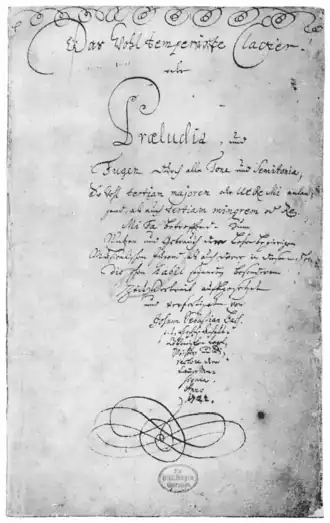 - ↑ De tekst luidt: Das Wohltemperirte Clavier oder Præludia, und Fugen durch alle Tone und Semitonia, so wohl tertiam majorem oder Ut Re Mi anlangend, als auch tertiam minorem oder Re Mi Fa betreffend. Zum Nutzen und Gebrauch der Lehrbegierigen Musicalischen Jugend, als auch derer in diesem studio schon habil seyenden besonderem Zeitvertreib auffgesetzet und verfertiget von Johann Sebastian Bach. p. t: Hochfürstlich Anhalt-Cöthenischen Capel-Meistern und Directore derer Camer Musiquen. Anno 1722.