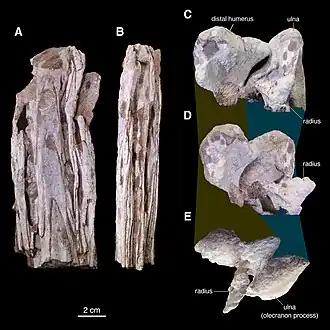 Bij de ellepijp is de processus olecrani, die de arm strekt, lang maar relatief slank met een hoogte die gelijk is aan de breedte van het onderste opperarmbeen. Het spaakbeen is relatief slank.