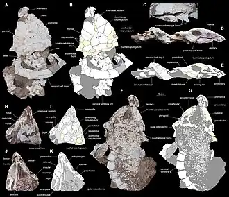 Het predentarium van de onderkaak wordt doorboord door foramina die wijzen op een ondersnavel. De caputegula op de onderkaak steekt onder de onderrand van de kaak uit.