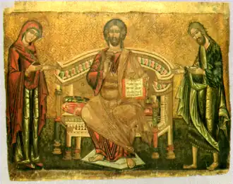 De voorstelling toont Christus op een troon als de ultieme rechter. Hij houdt een bijbel, open of gesloten, in de linkerhand. Christus wordt frontaal afgebeeld. Rechts van hem staat Maria, zijn moeder en aan zijn linkerzijde staat Johannes de Doper, zijn voorloper of wegbereider. Beiden staan in de voorspraakhouding: in profiel afgebeeld, lichtjes voorover gebogen en met hun armen en handen in een smekend gebaar. De vorm met drie figuren noemt men de kleine deësis.