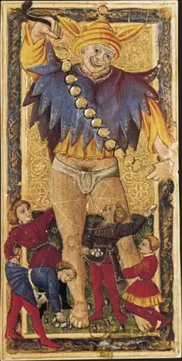 "Mat" zou kunnen verwijzen naar het schaakspel waar men op het einde van de partij (schaakmat), de koning klem zet en de koningin verovert. De nar (kijk naar de klederdracht van de figuur op de kaart) aan het koninklijk hof was ook de enige die gemachtigd was om met de koning te spotten. Hij kan dus beschouwd worden als zijnde machtiger dan de koning, en niet zo "dwaas" als men hem pleegt te noemen in modernere versies van het tarotspel.