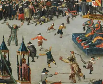 Het doek met de optocht van de Brusselse wapengilden op de Grote Markt is in de loop der tijden in twee gedeeld. Beide delen zijn verworven door het Victoria and Albert Museum. Elke gilde is herkenbaar aan haar schutspatroon. Vooraan (rechtsboven) lopen de schermers. Ze hebben Sint-Goedele bij - een duivel probeert haar lamp uit te blazen - en Sint-Michiel die met een zwaard zwaait en een duivel aan de ketting houdt. Na de schermers komen de haakbusschutters, geleid door een enorme Sint-Kristoffel. Hij draagt het Jezuskind en is in het gezelschap van een kluizenaar met een lantaarn. De handboogschutters zijn herkenbaar aan hun wapens, al tellen hun rangen ook drie rijen musketiers (voorafgegaan door hun kapitein en een vrouwelijke dwerg). Daarna volgen twee paarden die een slee met Sint-Niklaas trekken. Verderop volgt de Kleine Voetboog in het zog van hun patroon Sint-Joris. Hun vaandel bevat het wapen van Brussel en dat van aartshertog Albrecht. De gevangen draak ontbreekt evenmin, in tegenstelling tot de vijfde wapengilde, de Grote Voetboog, die op dat moment elders ontvangen werd.