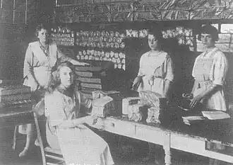 Verpakking van Couque Royale Extra bij De Vreese in 1935. vlnr: Eveline van Loo (zus van de echtgenote van Henri De Vreese), Lea De Vreese, ?, Elza De Vreese.[12]