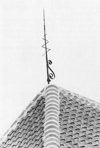 De dakbekroning van het pand bestaat uit smeedijzer in de vorm van een verticale piek met een hoogte van ongeveer 1 meter. De smeedijzeren voluut aan de rechterkant verbindt het geheel met de nok van het dak. Oorspronkelijk werd de top gesierd door een metalen wimpel. Deze dakbekroning is een decoratief en functioneel element dat bijdraagt aan het karakteristieke silhouet van het gebouw.