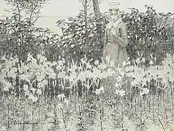 De annunciatie is een klassieke, iconische maar tegelijk ongebruikelijke verbeelding van de maagd Maria als een Hollands boerenmeisje, geplaatst in een ingesloten bloementuin met witte lelies. Hiermee geeft Hitchcock uitdrukking aan zijn gevoel dat de Christelijke geloofsbeleving onder de eenvoudige Hollandse plattelandsbevolking veel vitaler en authentieker was dan in de grote steden, niet verdorven door afleidende moderniteit. Die gepercipieerde zuiverheid drukt hij uit via tal van symbolen, op de eerste plaats met de lelie. Traditioneel staat de lelie in Nederland niet alleen symbool voor de maagdelijkheid, maar ook voor de aartsengel Gabriël. Ook het decor van de "hortus conclusus" geldt als een symbolische verwijzing naar de maagdelijkheid van Maria, zoals die vanouds al in afbeeldingen van de madonna werd toegepast.[1] Maria's zedig neergeslagen ogen en nederige houding impliceren dat ze op het punt staat en ook klaar is om de heilige boodschap te ontvangen. Om haar hoofd is een licht aureool weergegeven, ten teken van haar verhevenheid. De blauwe jurk refereert aan hemelse sferen en de witte sluier aan haar deugdzaamheid.[2]