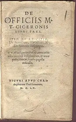 - Dit artikel of een eerdere versie ervan is een (gedeeltelijke) vertaling van het artikel De Officiis op de Engelstalige Wikipedia, dat onder de licentie Creative Commons Naamsvermelding/Gelijk delen valt. Zie de bewerkingsgeschiedenis aldaar.