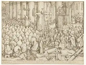 De rijkere burgers, die in de kerk op een bank hebben mogen zitten, verlaten de kerk langs de hoofdingang; een heer is vergezeld van een knechtje dat zijn eigen opvouwbare stoel draagt. Sommige vrouwen in zwarte huiken hebben buxustakjes bij, een gebruik dat verbonden is met Palmzondag. De rijkeren zijn door de vastenpreek herinnerd aan hun verplichting tot naastenliefde, en geven daarom aalmoezen aan de talrijk opgekomen bedelaars.