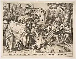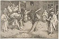 Vóór de herberg voeren toneelspelers een klucht op, De vuile bruid, een populaire voorstelling op Vastenavond. In dit spel stemt een boer er in een dronken bui mee in om in het huwelijk treden. 's Anderendaags volgt de ontnuchtering, wanneer hij ontdekt hoe vuil en slonzig zijn bruid eruitziet. In het tafereel zien we het bruidspaar dansen voor de schamele tent waar het bruidsbed staat opgesteld. Het gebeuren wordt muzikaal omlijst met een geïmproviseerd muziekinstrument. Een gemaskerd lid van het gezelschap collecteert geld met een spaarpot. Bruegel heeft dezelfde scène later hernomen in het ontwerp voor een houtsnede, die om onbekende redenen nooit is uitgegeven. Wel is dit ontwerp gebruikt voor een kopergravure, uitgegeven door Cock in 1570, dus na Bruegels dood. Het Latijnse vers bij deze prent ("Als Mopsus zelfs met Nisa trouwt, wat moeten wij dan niet van de liefde verwachten?"), ontleend aan Vergilius,[10] lijkt eerder een fijnzinnig-humanistische toevoeging door Cock.