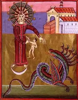 - De strijd met de draak heeft waarschijnlijk een mythische achtergrond. Er zijn vele verhalen over de strijd met een (zevenkoppige) draak. Ook de Hoer van Babylon wordt beschreven als zevenkoppige draak. In de Bijbel wordt de zevenkoppige draak genoemd in Openbaring van Johannes. Zie ook De draak met de zeven koppen.