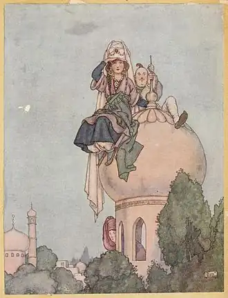 De jongen hoort over een prinses die opgesloten is. Er is voorspeld dat ze een ongelukkige liefde zal hebben. De jongen vliegt in zijn koffer naar de slapende prinses en kust haar. Hij vertelt de Turken god te zijn en de prinses gelooft hem. De jongen vertelt verhalen, ook over de ooievaars die kinderen brengen. Hij vraagt de prinses ten huwelijk en ze stemt toe. De jongen wordt uitgenodigd als de koning en koningin bij haar op theevisite zijn en hij moet dan een sprookje vertellen.