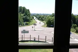 De kruising, gezien vanuit het museum. Links de weg vanaf Utah-Beach naar Carentan, rechtsonder de weg naar Saint-Côme-du-Mont.