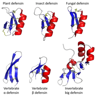 - ↑ (en) Shafee TM, Lay FT, Hulett MD, Anderson MA (2016). The Defensins Consist of Two Independent, Convergent Protein Superfamilies. Molecular Biology and Evolution 33 (9): 2345–56. PMID 27297472. DOI: 10.1093/molbev/msw106.