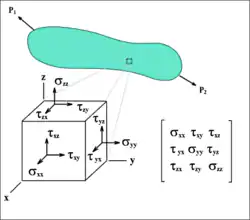 In de continuümmechanica is de spanningstoestand op een bepaald punt in een continuüm te benaderen door dit punt als een infinitesimaal klein kubusje te zien. Op alle zijden van het kubusje staat een bepaalde spanning, te verdelen in drie componenten. Als we aannemen dat de kubus in evenwicht verkeert, is de spanning op parallelle zijden gelijk, zodat drie zijden overblijven met elk drie componenten. Deze in totaal negen componenten kunnen in een drie bij drie tensor worden gezet: