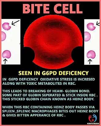 - ↑ a b Yoo, D, Lessin, LS (1992). Drug-associated 'bite cell' Hemolytic anemia. The American Journal of Medicine 92 (3): 243–8. PMID 1546722. DOI: 10.1016/0002-9343(92)90071-I.
