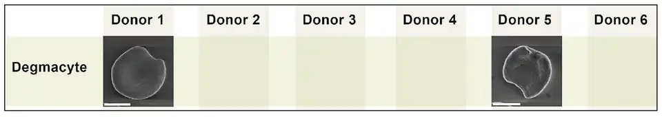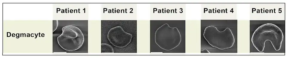 Degmacyten lijken meestal kleiner, dichter en meer samengeknepen dan een normale rode bloedcel vanwege de stukjes uit de celrand.[5] Het uiterlijk van de stukjes in rode bloedcellen kan variëren in aantal, gladheid en grootte.[5] Deze cellen kunnen ook andere perifere effecten vertonen.[2]