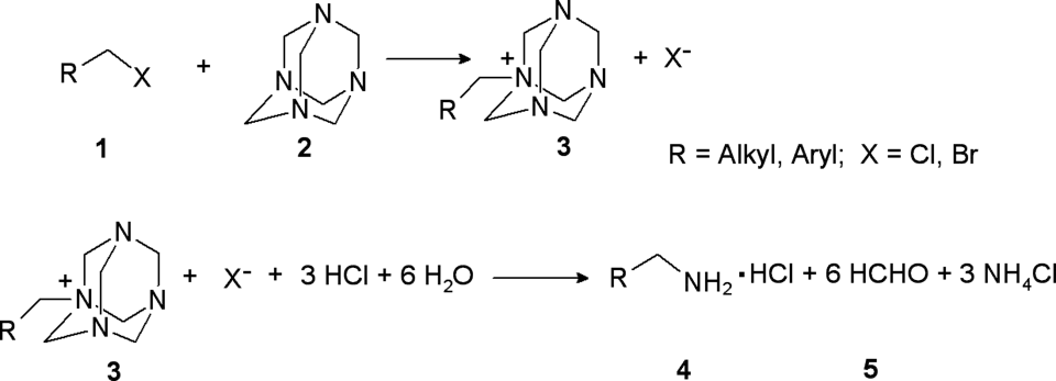 Het ammoniumzout bindt zes moleculen water en vormt daarbij formaldehyde (5). Met een oplossing van zoutzuur in ethanol verkrijgt men het hydrochloridezout van het amine (4); door neutralisering met een sterke base zoals natriumhydroxide bekomt men het vrije amine.