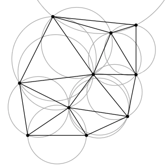 Deze triangulatie voldoet niet aan de delaunay-voorwaarde: de omgeschreven cirkels bevatten meer dan drie punten. -