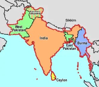 De opdeling van Brits-Indië op 14/15 augustus 1947 leidde tot de twee onafhankelijke staten India en het Dominion Pakistan (later opgedeeld in Pakistan en Bangladesh), en vond plaats op grond van godsdienst.