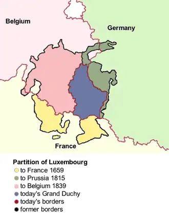 Toen de Fransen in 1795 de Nederlanden veroverden werd Luxemburg als een deel van het Woudendepartement direct bij Frankrijk ingelijfd. Na afloop van de revolutionaire en Napoleontische oorlogen, op het Congres van Wenen, werd Luxemburg samengevoegd met het Graafschap Vianden, dat tot de Franse tijd in handen was van de prinsen van Oranje-Nassau, en het voormalige graafschap Bouillon uit de Oostenrijkse Nederlanden. Het nieuwgeschapen landje werd verheven tot groothertogdom, met de Oranjes als groothertogen. Dit was een compensatie aan Willem I voor het gebiedsverlies van Nassau aan Pruisen. De Duitse Bond en Pruisen maakten echter aanspraak op het versterkte stadje Bitburg en omgeving in het noordoosten, omdat dit een essentiële schakel in de westelijke verdedigingslinie van de Duitse Bond en Pruisische Rijnprovincie zou vormen. Koning Willem I, die al grotendeels had gekregen wat hij verlangde, ging niet met de Pruisen in discussie. Zo verloor Luxemburg 2.280 km² aan Pruisen (later Duitsland), wat overeenkwam met ongeveer 24% van de toenmalige oppervlakte. De definitieve grens met Pruisen werd met het traktaat van Aken in 1816 vastgelegd.