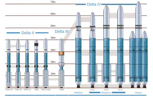 De zwaarste configuratie heet Delta IV Heavy en heeft twee extra eerste trappen aan weerszijden als strap-on-boosters en een verlengde 5 meter-neuskegel voor grotere vrachten.