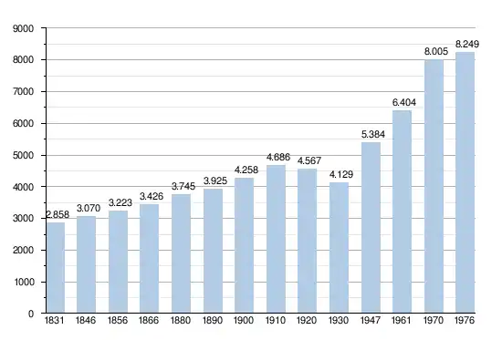 - Bron:NIS - Opm:1831 t/m 1970=volkstellingen op 31 december; 1921= inwonertal op 31 december;1976= inwoneraantal per 31 december