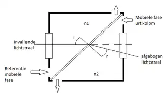 De brekingsindexdetector (RI-detector) is gebaseerd op het principe van de brekingsindex (refractie-index). De detector bestaat schematisch uit twee compartimenten, waarvan één is gevuld met pure mobiele fase en één met de mobiele fase, die van de kolom af elueert. In de praktijk gebeurt het vaak dat de optische eigenschappen van deze media verschillen, en vaak komen deze fases slechts bij één golflengte overeen. Het uitgezonden licht is daarom praktisch altijd monochromatisch. Wanneer er een stof uit de kolom elueert, verandert deze stof de optische eigenschappen van de mobiele fase, waardoor ook de refractie-index verandert. Deze verandering van de refractie-index wordt gevisualiseerd in de vorm van een verandering van de hoek van de uitgezonden lichtstraal. Door middel van terugkoppeling kan deze verandering geregistreerd worden en uitgezet. De detector registreert zowel positieve als negatieve pieken, waardoor de nullijn van de grafiek in het midden is uitgezet.