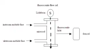 Een flowcel wordt gebruikt als sensor waar het exciterende licht axiaal doorheen gaat. Een fotocel zit gevestigd aan de kant van de cel om het uitgezonden licht op te vangen. De celwand wordt vaak gemaakt van Pyrex glas om te verhinderen dat het exciterende licht (meestal uv-licht) de fotocel bereikt. Wanneer het fluorescente monster in de cel zit, absorbeert deze het exciterende licht en zendt dit in een andere golflengte weer uit. Het geëmitteerde licht en wordt ontvangen door de fotocel. De intensiteit van het licht wordt door een computer geregistreerd. Het exciterende licht kan bij 254 nm (uv) door een kwiklamp veroorzaakt worden, of het licht kan van een deuteriumlamp zijn dat bij elke golflengte geproduceerd kan worden door een monochromator.