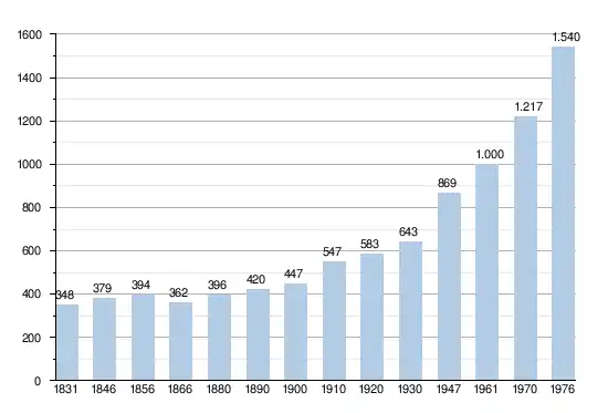 - Bronnen:NIS, Opm:1831 tot en met 1970=volkstellingen; 1976 = inwoneraantal op 31 december