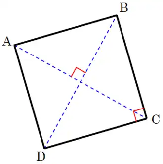 - In de meetkunde is een diagonaal een type lijnstuk tussen twee niet-aangrenzende hoekpunten van een veelhoek. Een vierhoek heeft bijvoorbeeld altijd twee diagonalen. De definitie van een convexe veelhoek komt ermee overeen, dat alle diagonalen geheel binnen de veelhoek liggen. Dit is voor concave veelhoeken niet zo, daar kunnen de diagonalen dus buiten de veelhoek liggen. Het totaal aantal diagonalen in een -hoek bedraagt . De twee diagonalen van een vierkant staan loodrecht op elkaar. De lichaamsdiagonalen van een figuur in meer dan twee dimensies, zoals de veelvlakken in drie dimensies, verbinden ook steeds twee hoekpunten van die figuur met elkaar, die niet in hetzelfde zijvlak liggen.