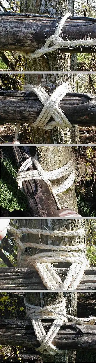 - Vervolgens legt men een drietal wikkelingen rond beide hoeken, te beginnen met de grootste hoeken (dus over de reeds gelegde timmersteek.)