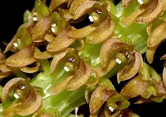 De bloemen zijn al dan niet geresupineerd en groen, bruin, geel, roze of paars gekleurd. De kelkbladen zijn vrijstaand of gefuseerd, de kroonbladen smaller en steeds vrijstaand. De bloemlip is drielobbig of uit één stuk, soms hol aan de basis, zonder mentum of callus maar met onduidelijke longitudonale richels, parallel aan het gynostemium. De helmknop draagt vier kegelvormige, wasachtige pollinia in paren van twee.
