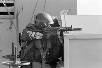 | SIG MCX | Aanvalsgeweer | .300 AAC Blackout | Dit wapen gebruikt het zogenaamde .300 AAC Blackout-patroon[27], dat met 7,62×35 mm een groter penetrerend vermogen heeft dan de gebruikelijke 5,56×45mm-munitie. Ook is de MCX uitgerust met de SIG Sauer Suppressed Upper Receiver (SUR), een geïntegreerde geluiddemper. Verder is dit wapen uitgerust met een aangepaste kolf, richtmiddelen en een laser- en lichtmodule. | ||