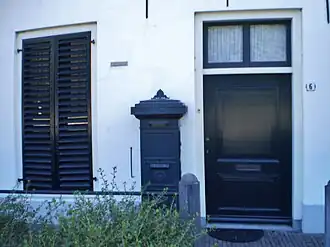Tegen de voorgevel staat een historische staande brievenbus van de Posterij, die als enige in Nederland groen is in plaats van rood, teneinde het uitzicht van koningin Wilhelmina vanuit het paleis niet te bederven.[1][2]