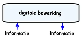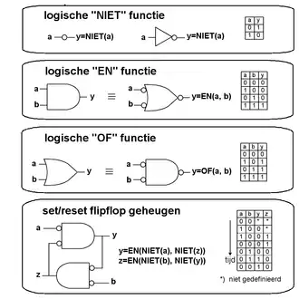 Voor de digitale bewerking wordt gebruikgemaakt van digitale bouwstenen die logische of booleaanse functies kunnen uitvoeren, dat wil zeggen wiskundige functies met als input én als output binaire waarden, die hier als "0" en "1" zijn gedefinieerd. Een instantie van een binaire waarde wordt bit genoemd, een samentrekking van "binary digit". Net zoals in het decimale stelsel met meerdere cijfers willekeurig grote getallen kunnen worden gevormd, kan dit ook met meerdere bits. Zo kunnen met 64 bits de gehele getallen tot ruwweg 1,84 × 1019 (meer dan 1 met 19 nullen erachter) weergegeven worden. Twee fundamentele logische functies zijn y=NIET(a) en y=EN(a, b) en van deze twee kunnen alle mogelijke andere logische functies worden afgeleid. Zo is y=OF(a, b) identiek met de functie y=NIET(EN(NIET(a), NIET(b))), zoals in nevenstaande figuur aangegeven is. Met combinaties van digitale bouwstenen, ook wel combinatorische logica genoemd, kunnen alle denkbare digitale functies ontworpen en gebouwd worden, zoals een rekenmachine of microprocessor.
