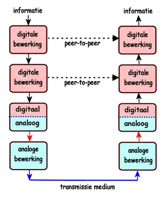 In de figuur zijn als voorbeeld twee digitale bewerkingslagen onder elkaar aangegeven. Informatie die het blok aan de zendzijde binnenkomt, gaat fysiek naar het blok eronder, maar het lijkt net alsof deze informatie rechtstreeks naar het corresponderende bovenste blok aan de ontvangstzijde gaat. Dit noemt men peer-to-peercommunicatie tussen gelijkwaardige protocol-lagen. Zo worden via het bovenste blok complete bestanden overgezonden, terwijl in werkelijkheid dit blok ieder bestand in frames opdeelt en die frames fysiek doorstuurt naar het eronder gelegen blok, waarbij het weer lijkt alsof die frames rechtstreeks naar het corresponderende blok aan de ontvangstzijde gaan. In het bovenste blok aan de ontvangstzijde worden de frames weer samengevoegd tot complete bestanden.