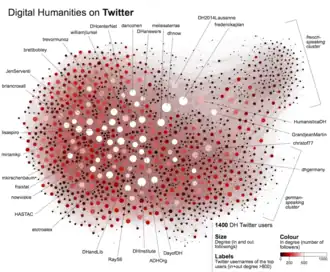 - ↑ Grandjean, Martin (2016). A social network analysis of Twitter: Mapping the digital humanities community. Cogent Arts & Humanities 3 (1): 1171458. DOI: 10.1080/23311983.2016.1171458.
