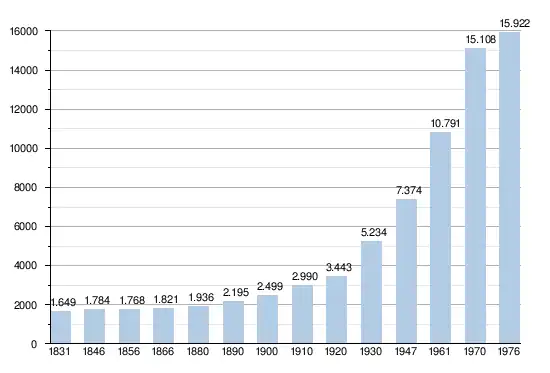- Bronnen:NIS, Opm:1831 tot en met 1970=volkstellingen; 1976 = inwonertal op 31 december