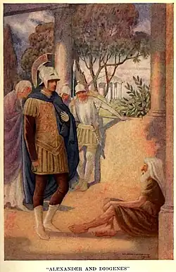 Volgens een door Plutarchus opgetekend verhaal was Alexander de Grote zeer geïnteresseerd in Diogenes. Hij maakte volgens dat verhaal een lange reis om hem te ontmoeten. Toen Alexander hem op een zonnige dag aantrof, vroeg hij aan hem wat hij wilde hebben. Hij kon alles krijgen. Diogenes zei toen half ontwijkend, waarschijnlijk beducht voor een twistgesprek met de licht ontvlambare veroveraar: "Als ik alles kan krijgen, wil je dan een stap opzij doen, want je staat voor de zon".[8] Hierop zei Alexander: "Als ik Alexander niet was, zou ik Diogenes willen zijn". Diogenes zei daarop: "Als ik Diogenes niet was, zou ik ook Diogenes willen zijn". Volgens de overlevering stierf Diogenes op dezelfde dag als Alexander: 10 juni 323 v.Chr.[9]
