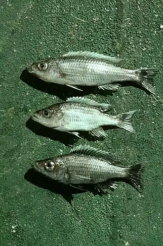 | Diplotaxodon apogon (midden), tussen andere Diplotaxodon soortgenoten uit Lake Malawi | |||||||||||||||||||||