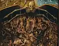 Het onderste tafereel bestaat uit een afbeelding van de dood met de beenderen van zijn armen en benen gespreid boven de hellemond. Onder hem vallen de naakte lichamen van de verdoemden in de hel. In de hel herkent men evengoed dan in de hemel wereldlijke en kerkelijke hoogwaardigheidsbekleders, maar hier gepijnigd door de vlammen en gekweld door de duivels.
