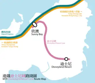Deze metrolijn gaat naar Disneyland Hongkong en is 's werelds tweede metro/treinverbinding naar een Disneyland ter wereld. Toen in oktober 1999 besloten werd om een Disneyland in Hongkong aan te leggen werd al gesproken over een metroverbinding. Nadat daarmee ingestemd werd begon in juli 2002 de bouw van een "sprookjesachtige metrolijn" zonder machinist. Deze route heeft maar één spoor dus kan er ook maar één trein rijden. Na de opening van Station Sunny Bay op 1 juni 2005 werd het Station Disneyland Hongkong op 1 augustus 2005 in gebruik genomen en rijden de kleurrijke en van binnen versierde treinen.